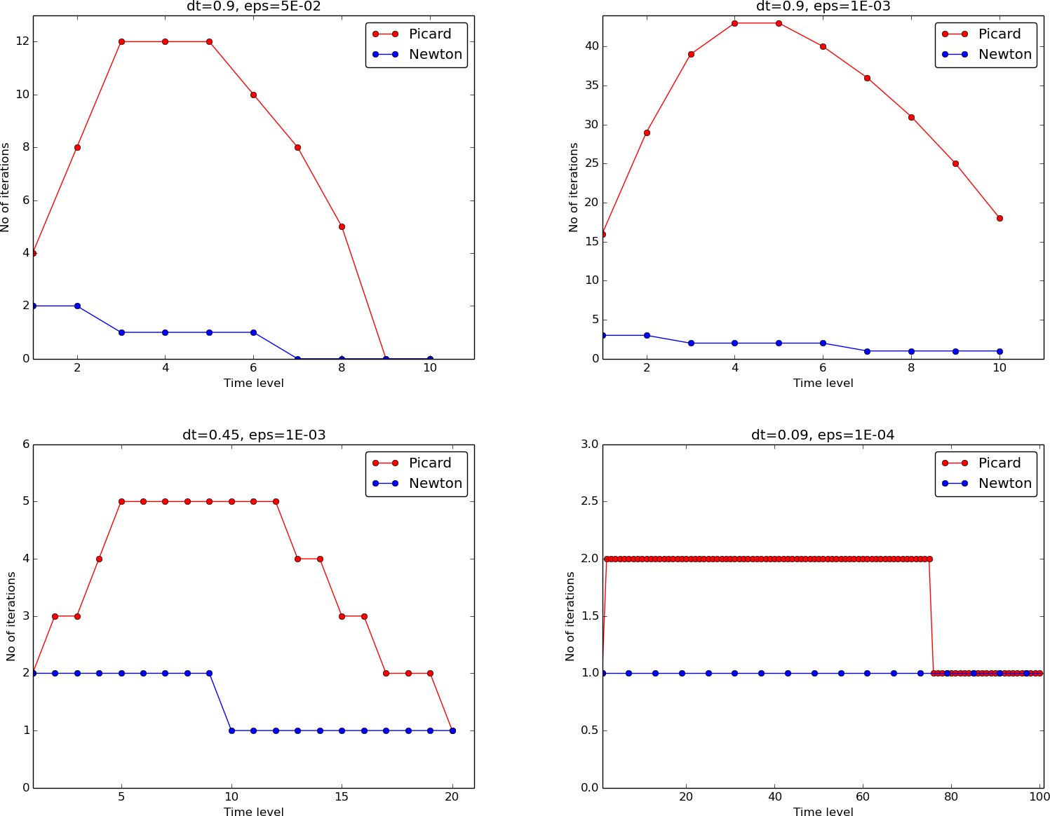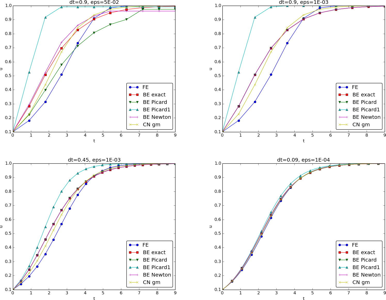 We shall later refer to the strategy of taking one Picard step, or equivalently, linearizing terms with use of the solution at the previous time step, as the Picard1 method. It is a widely used approach in science and technology, but with some limitations if \(\Delta t\) is not sufficiently small (as will be illustrated later).