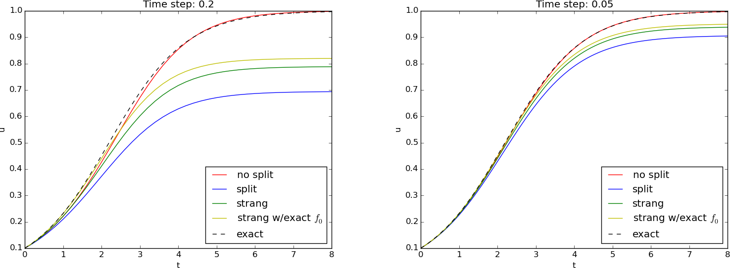 The Forward Euler method is an explicit method. When applied to (5.1), sampled at \(t=t_n\), it results in \[ \frac{u^{n+1} - u^n}{\Delta t} = u^n(1 - u^n), \] which is a linear algebraic equation for the unknown value \(u^{n+1}\) that we can easily solve: \[ u^{n+1} = u^n + \Delta t\,u^n(1 - u^n)\tp \] In this case, the nonlinearity in the original equation poses no difficulty in the discrete algebraic equation. Any other explicit scheme in time will also give only linear algebraic equations to solve. For example, a typical 2nd-order Runge-Kutta method for (5.1) leads to the following formulas: