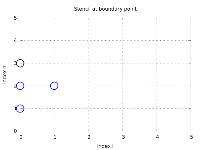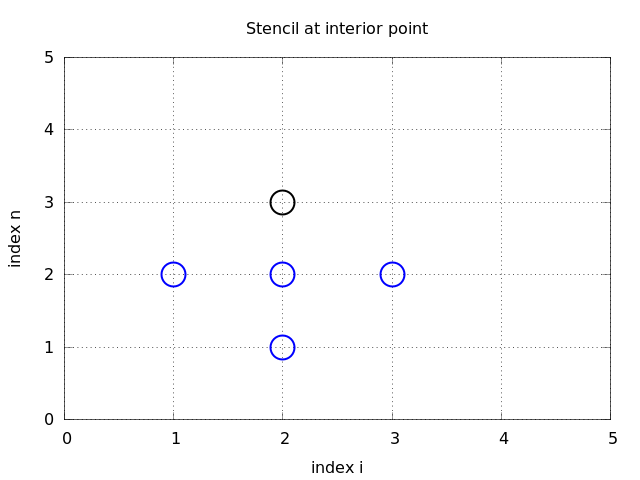 A characteristic feature of (2.7) is that it involves \(u\) values from neighboring points only: \(u_i^{n+1}\), \(u^n_{i\pm 1}\), \(u^n_i\), and \(u^{n-1}_i\). The circles in Figure Figure 2.1 illustrate such neighboring mesh points that contribute to an algebraic equation. In this particular case, we have sampled the PDE at the point \((2,2)\) and constructed (2.7), which then involves a coupling of \(u_1^2\), \(u_2^3\), \(u_2^2\), \(u_2^1\), and \(u_3^2\). The term stencil is often used about the algebraic equation at a mesh point, and the geometry of a typical stencil is illustrated in Figure Figure 2.1. One also often refers to the algebraic equations as discrete equations, (finite) difference equations or a finite difference scheme.