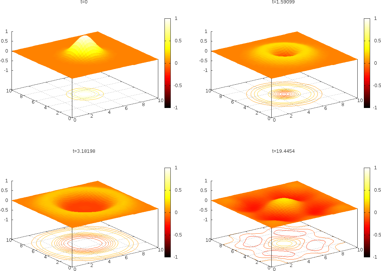 It is common to use such exact solutions of physical interest to verify implementations. However, the numerical solution \(u^n_i\) will only be an approximation to \(\uex(x_i,t_n)\). We have no knowledge of the precise size of the error in this approximation, and therefore we can never know if discrepancies between \(u^n_i\) and \(\uex(x_i,t_n)\) are caused by mathematical approximations or programming errors. In particular, if plots of the computed solution \(u^n_i\) and the exact one (2.20) look similar, many are tempted to claim that the implementation works. However, even if color plots look nice and the accuracy is “deemed good”, there can still be serious programming errors present!