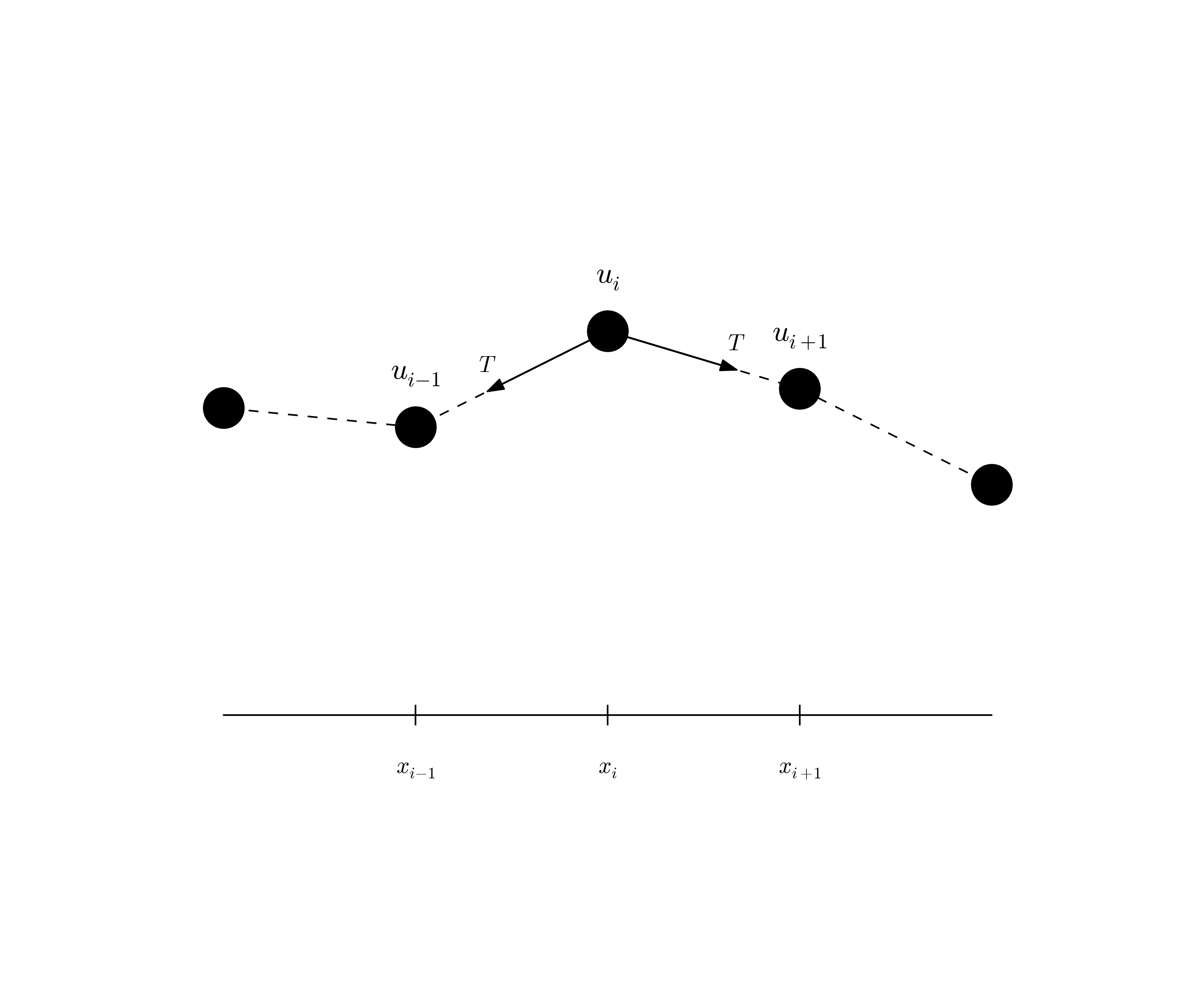 Even though sound reasoning leads up to (2.10), there is still a minor challenge with it that needs to be resolved. Think of the very first computational step to be made. The scheme (2.10) is supposed to start at \(n=1\), which means that we compute \(u^2\) from \(u^1\) and \(u^0\). Unfortunately, we do not know the value of \(u^1\), so how to proceed? A standard procedure in such cases is to apply (2.10) also for \(n=0\). This immediately seems strange, since it involves \(u^{-1}_i\), which is an undefined quantity outside the time mesh (and the time domain). However, we can use the initial condition (2.9) in combination with (2.10) when \(n=0\) to eliminate \(u^{-1}_i\) and arrive at a special formula for \(u_i^1\): \[ u_i^1 = u^0_i - \half C^2\left(u^{0}**{i+1}-2u^{0}**{i} + u^{0}_{i-1}\right) \tp \tag{2.11}\] Figure Figure 2.2 illustrates how (2.11) connects four instead of five points: \(u^1_2\), \(u_1^0\), \(u_2^0\), and \(u_3^0\).